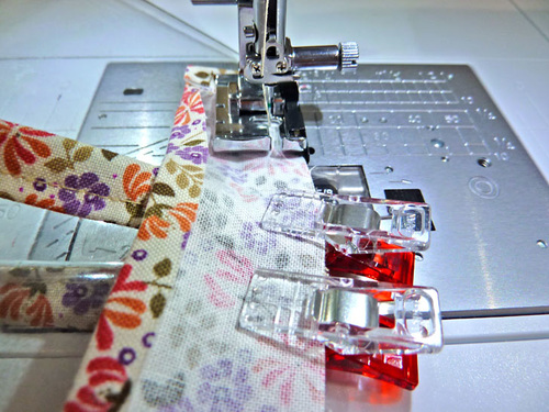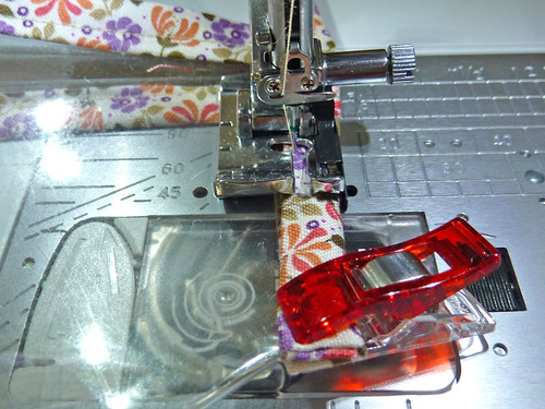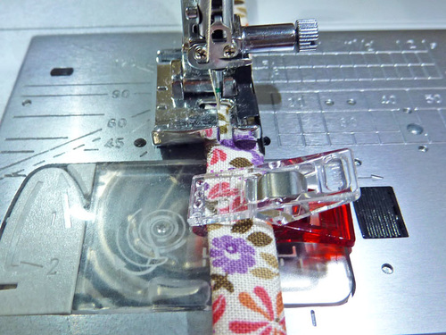 - Then bring the folded edge of the binding down, wrapping the raw edges of the seam allowance. The folded edge should cover the seam line. Clip in place.