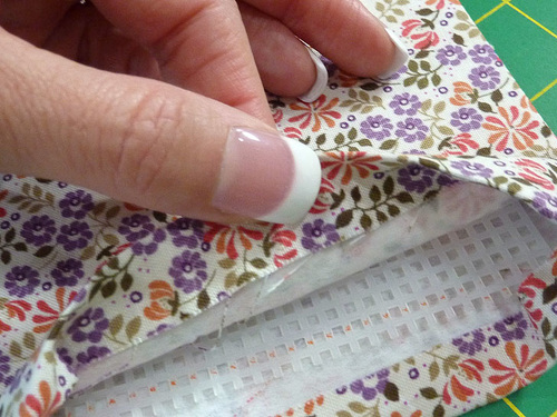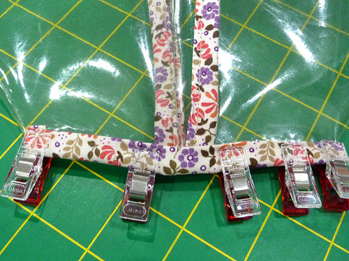 - Stitch through all layers to secure. You now have finished bound seams on the inside of the clear tote.
