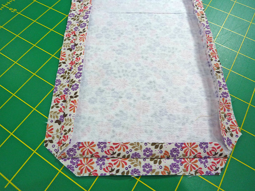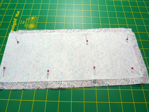 - Find the top trim/facing panels and their matching lightweight interfacing panels. Place an interfacing panel on the wrong side of each facing panel; all edges of both layers should be flush. Following manufacturer’s instructions, fuse in place.