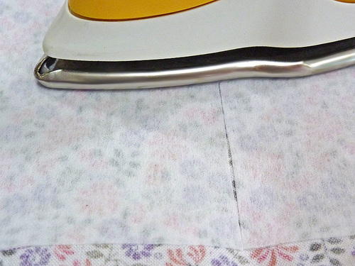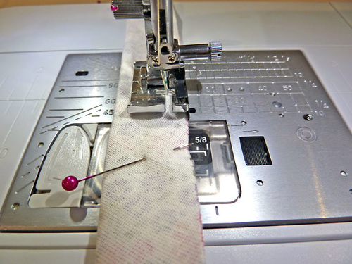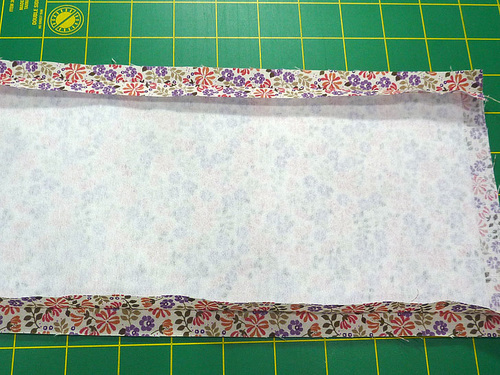 - Place the interfacing strips on the wrong side of the fabric, aligning them along one half of the fabric strip with the center crease line as a guide. There should be ½” of fabric showing beyond the interfacing along the remaining sides. The interfacing should be butted together end to end. Following manufacturer’s instructions, fuse in place.