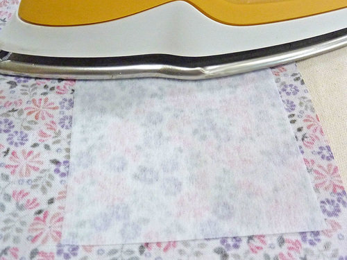 - Fold the fabric squares in half, wrong sides together, and press to set a center crease. Unfold wrong side up so the crease line is visible. Place a piece of interfacing on each fabric square, aligning one long edge of the interfacing with the center crease line of the fabric. There should be ¼” of fabric showing beyond the interfacing on the other three sides. Following manufacturer’s instructions, fuse in place.