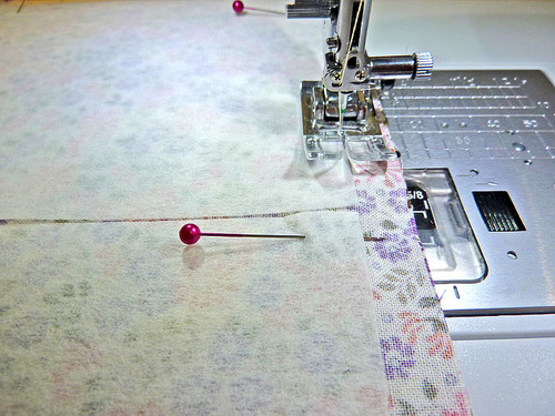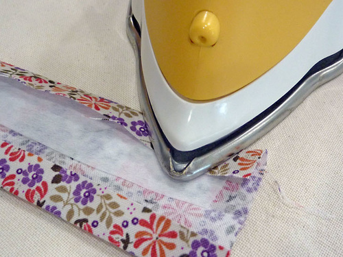 - Apply the interfacing to the wrong side of each fabric strip. All raw edges of both layers should be flush. Following manufacturer’s instructions, fuse in place.
