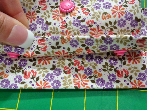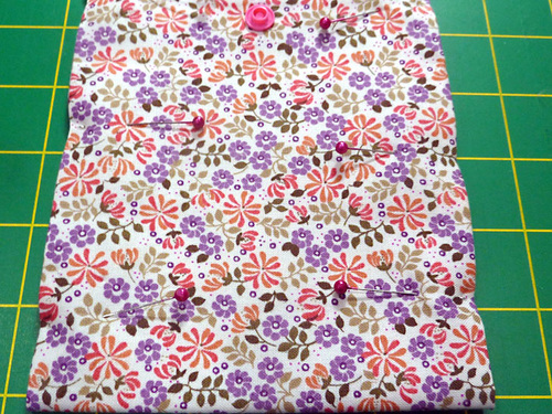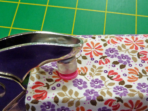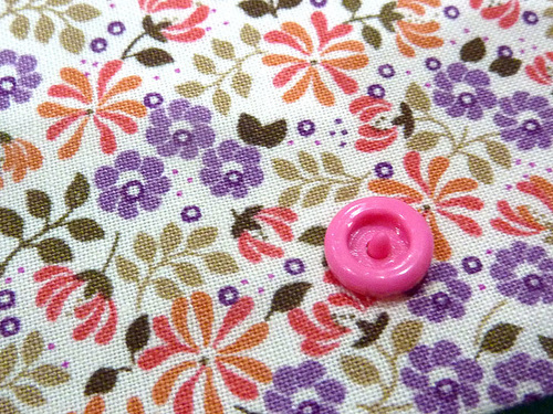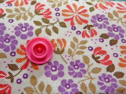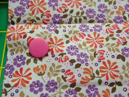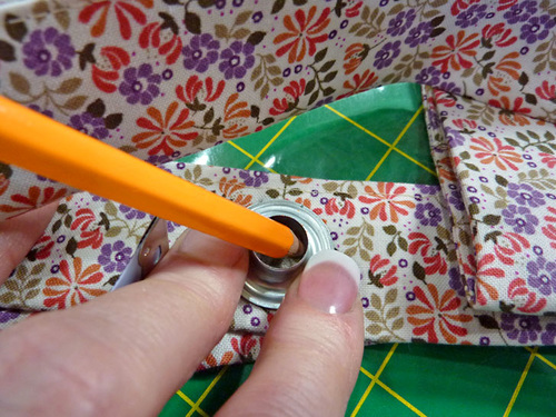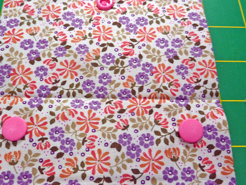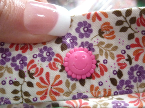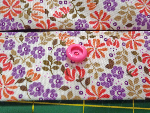 - Following the same steps as above, insert the two snap halves. The happy flower caps should be facing out on the exterior of the bag – the back/outside of the bag.