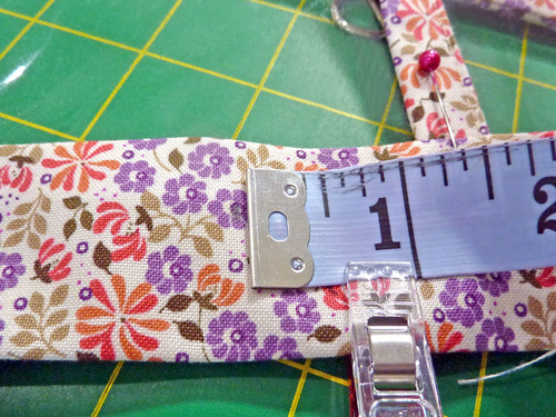 - Bring the end back on itself about 1” and pin in place. Stitch across through all the layers to secure the slider in place.
