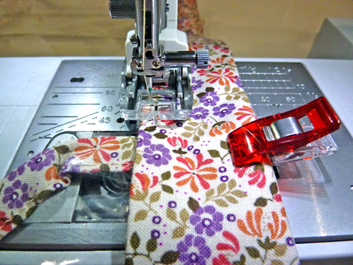 - As above, pull up the binding then wrap the folded edge around the raw edges of the seam allowance, covering the seam line. Clip in place. Remember, those binding ends should be tucked under.