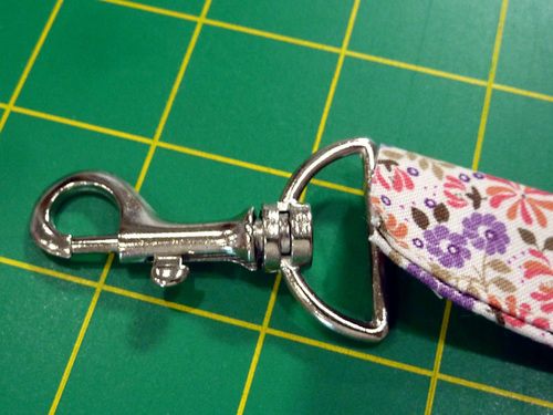 - Keep pulling the raw end through, eventually threading it through the remaining 1” Swivel Hook. Pull the raw end back on itself about 1” and tuck under the raw end. Pin in pace and then stitch in place as you did above to secure the Slide Adjuster. Before stitching, do a quick check to make sure there are no twists in your strap.