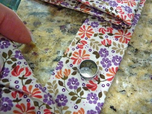 - Turn the loop right side out. Fold in half along the original center crease line (wrong sides together) but keep the outer edges raw and flat (in other words, do not re-fold the long edges ½”).