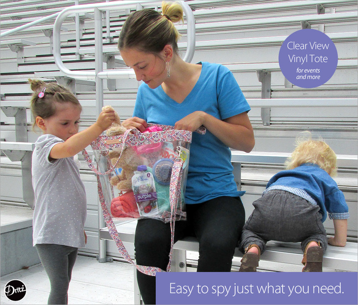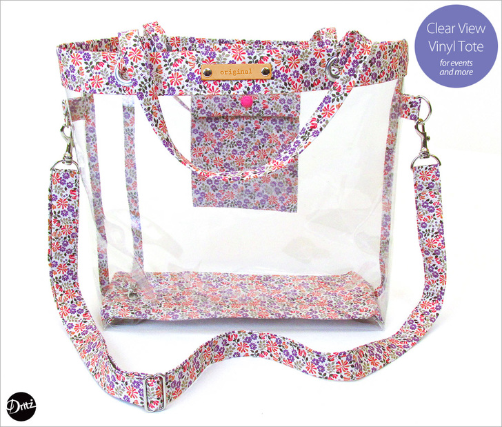Our Clear View Vinyl Tote finishes at approximately 12” high x 12” wide x 5” deep with standard carry handles and a fully adjustable shoulder/crossbody strap.
