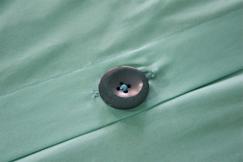 - Lay the smaller buttonhole back piece along the bottom of the duvet, right side down. Align the three raw edges of the back piece with the bottom and side raw edges of the duvet top. The hemmed edge with the buttonholes is pointing up, towards the middle of the duvet.