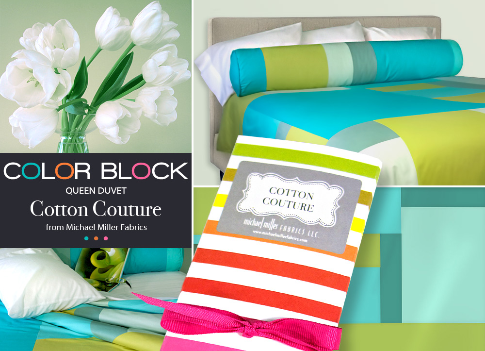 Here’s a little secret about a duvet. People who don’t sew are really impressed when you tell them you’ve just finished making duvet for your comforter (immediately after you explain what a duvet is). When this happens… simply smile, accept the ohhhs and ahhhs, but do not go on to explain that a duvet is really just a giant bag. There’s nothing wrong with being impressive! Besides, we’ve amped up the awe-inspiring potential by creating a unique patchwork design with big, beautiful blocks of solid color in a Mondrian style of random intersecting rectangles. This clean, modern look is also referred to as Color Block, which is very much on-trend with the latest in home décor. We used a selection of calming colors from Michael Miller’s Cotton Couture collection. With 118 colors of Cotton Couture solids to choose from, including 28 new tones that came out this Spring, you’re sure to find the perfect combination for your bedroom.