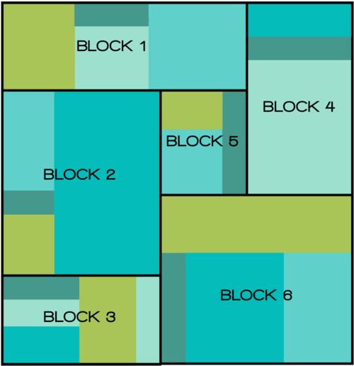 The duvet top is made up of 23 pieces sewn into six blocks. You’ll create the six individual blocks, then assemble them in the order shown below.
