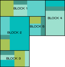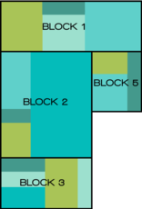 - Sew Block #4 to the right edge of Block #1/Block #5.