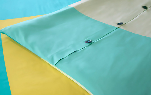 NOTE: We chose the envelope style opening for this duvet over the more traditional “open sack” variety, which usually has buttons or ties visible along the bottom edge to secure the comforter inside the duvet. Buttons or ties would have been too busy for this sleek Mondrian-style design. Instead, an envelope opening allows the bottom and top edges to be as clean and straight as the sides. - Lay duvet cover right side up on a flat surface. It’s big… that probably means the floor.