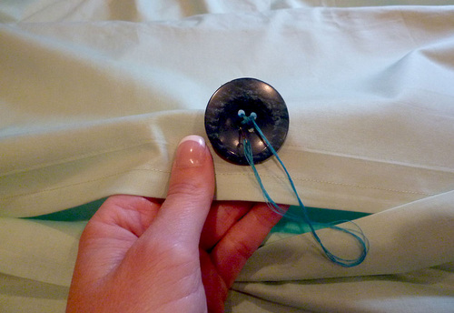 - Following the instructional manual for your machine, make SIX 2″ horizontal buttonholes. The buttonholes should be centered top to bottom within the hem and evenly spaced across the width. We placed ours from both sides at 10″, 22″ and 35″.