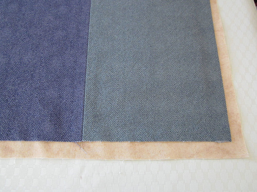 - The two layers of fabric stick together just like a flannel board, so it isn’t necessary to stitch the layers together along the outer perimeter. When done with all the ditch quilting, trim the interlining to match the color block panel.