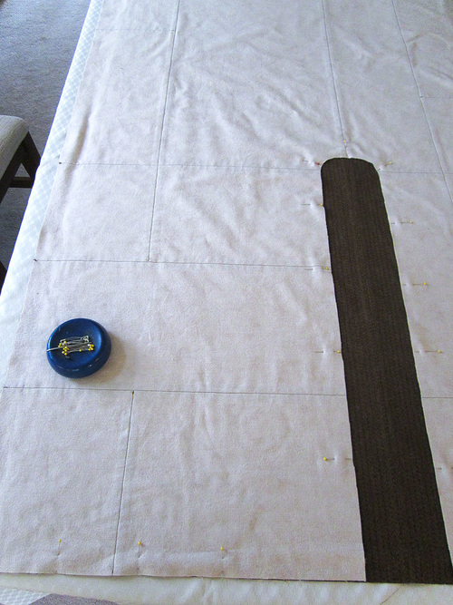 - The bottom of the pattern should be flush with the bottom raw edge of the fabric panel. The top will extend just above the panel’s main horizontal seam. Pin along one side…