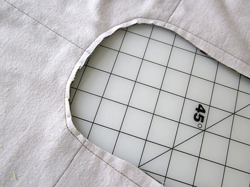 - Cut around the curve and continue right up into the neckline opening. You are cutting away the inside layer to match the front. Make sure you maintain a smooth curve from the bottom edge up into the opening.