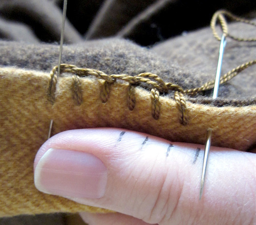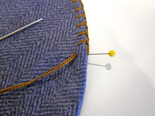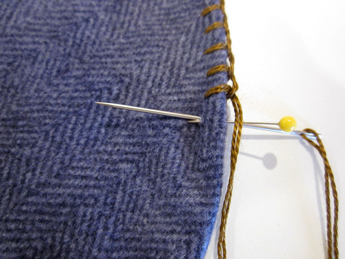 - Hold the two edges together and start your blanket stitch edge. As you can see in the photo above, you can use a pin to create the proper amount of slack in the first stitch.