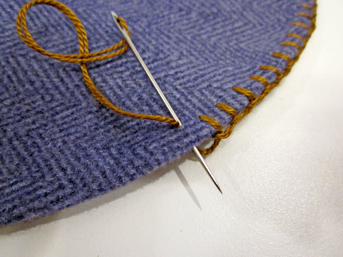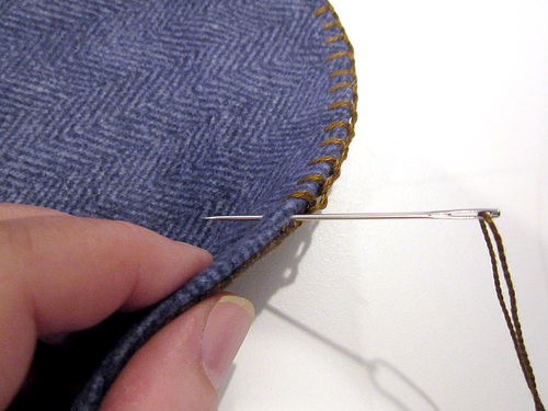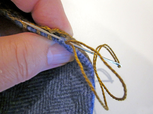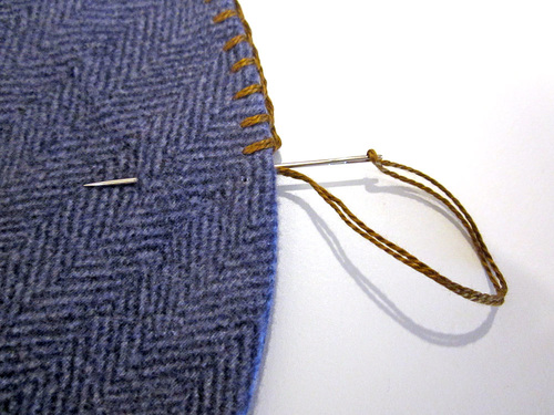 - Start the stitching at the opening along the side. There is no need to hand stitch that opening closed first. The blanket stitch will close it, and the opening makes a perfect place to start since the knotted end of your floss can be hidden inside the open seam.