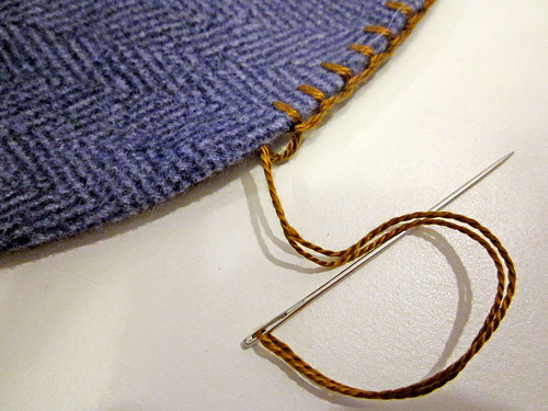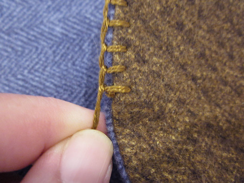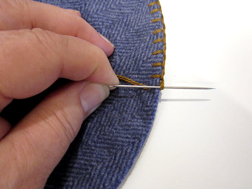 - The last step is to catch the top of the previous stitch to begin your new run of blanket stitching. This will also bury and hide the knot.