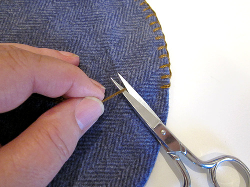 - Pull the needle through, and holding it taut, trim the thread close to the fabric. When you make the cut, the thread tails will snap back and disappear between the layers.