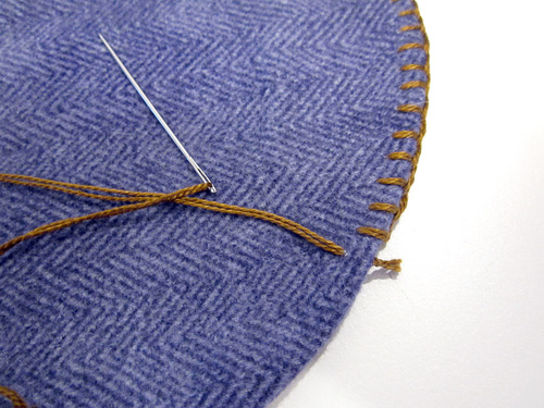- Continue the blanket stitch around the outer edge of the poncho until you reach your starting stitch. Catch the beginning stitch and bury the thread in the layers of the seam, following the same method as stopping and starting a length of floss. Your result will be a perfect continuous line of blanket stitching.