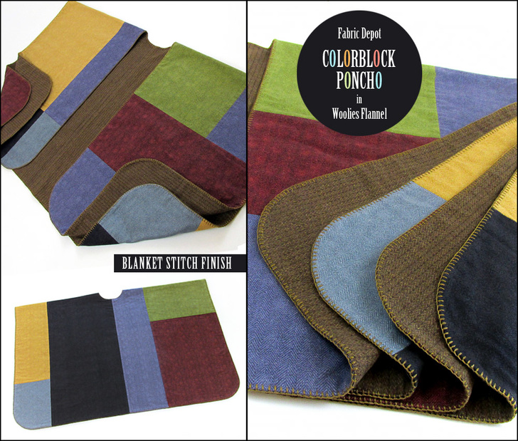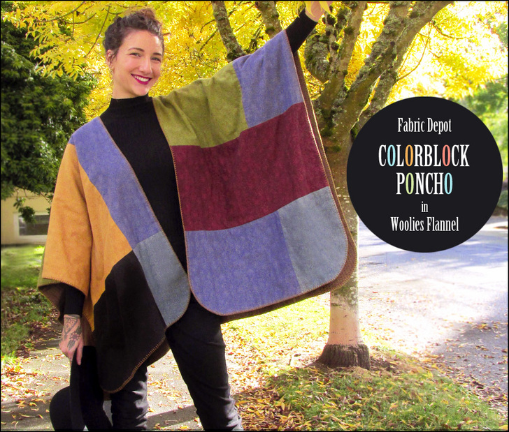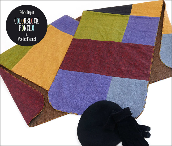 The trees are turning here in the Pacific Northwest, and although we’re well known for our stately evergreens, there are all kinds of amazing gold, red, and brown leaves swirling in the wind right now. We were inspired by these gorgeous fall tones when designing our Color Block Poncho. Made entirely from soft, smooth flannel, it has the weight and drape of wool but without any of the scratchiness, so it’s perfect to wear around your face and neck. We selected seven amazing herringbone colors from the Woolies Flannel collection from Maywood Studios.