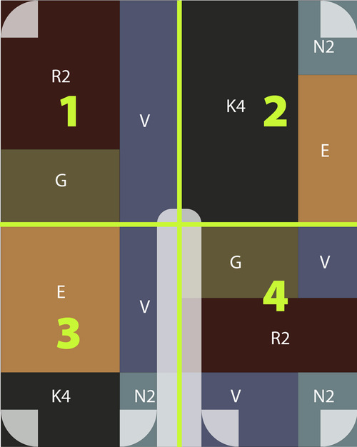 - The exterior color block pattern is made up of four equal quadrants to make the patchwork easy. The illustration below shows you the dividing lines.
