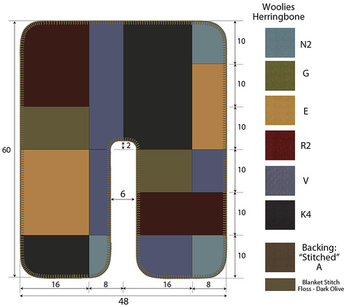 NOTE: Flannel usually has about a 4% shrinkage; our yardage recommendations below take this into account. Throughout our instructions, we will refer to our fabrics by their alpha-numeric code (N2, G, etc.). The illustration below shows the finished measurements and gives you a color key for our specific Woolies Herringbone selections.