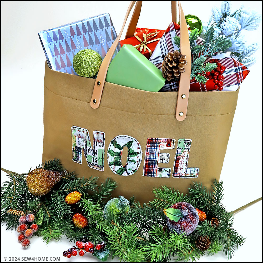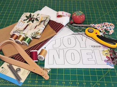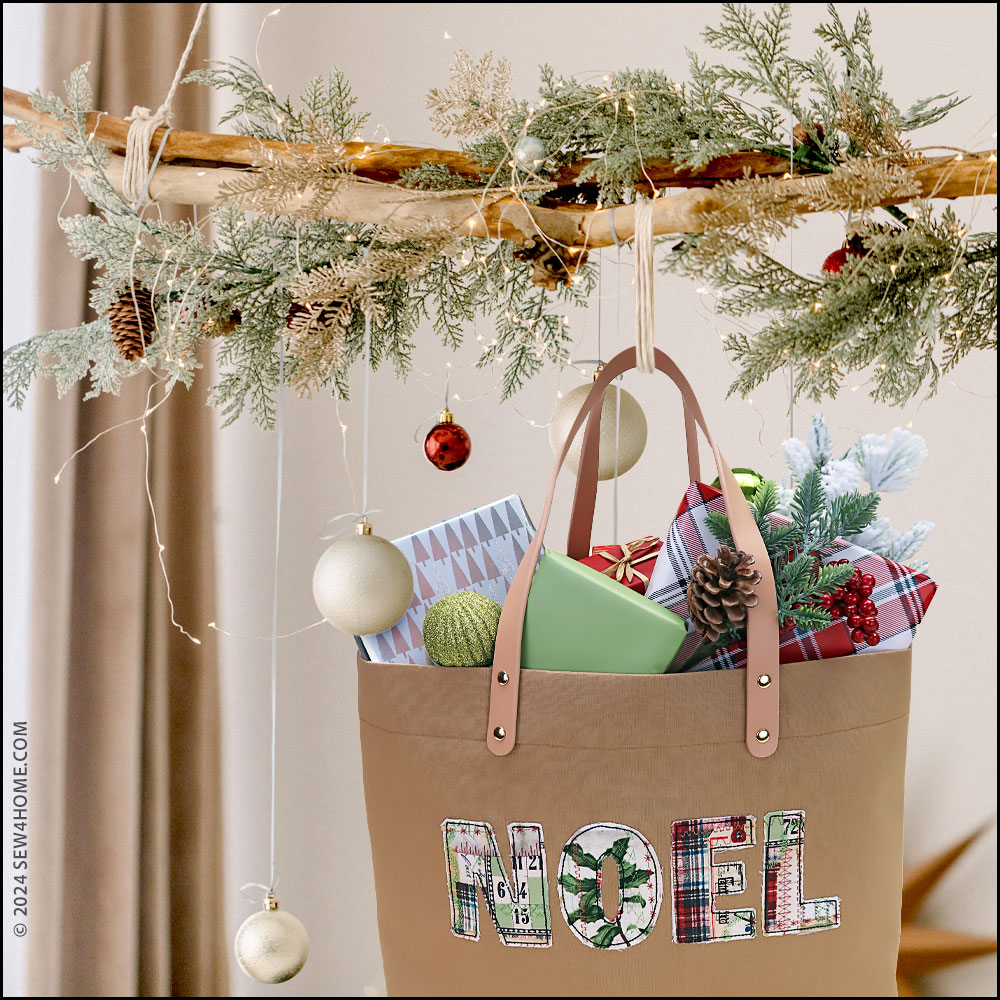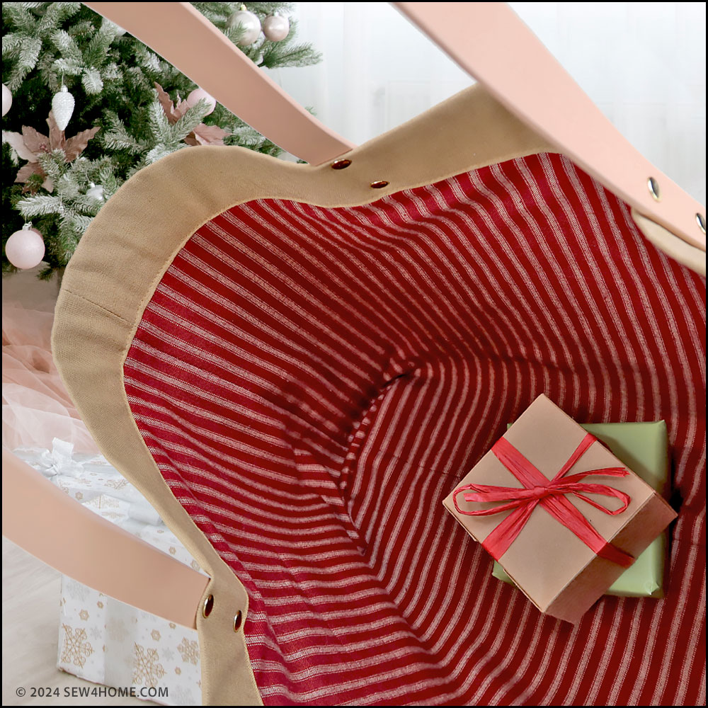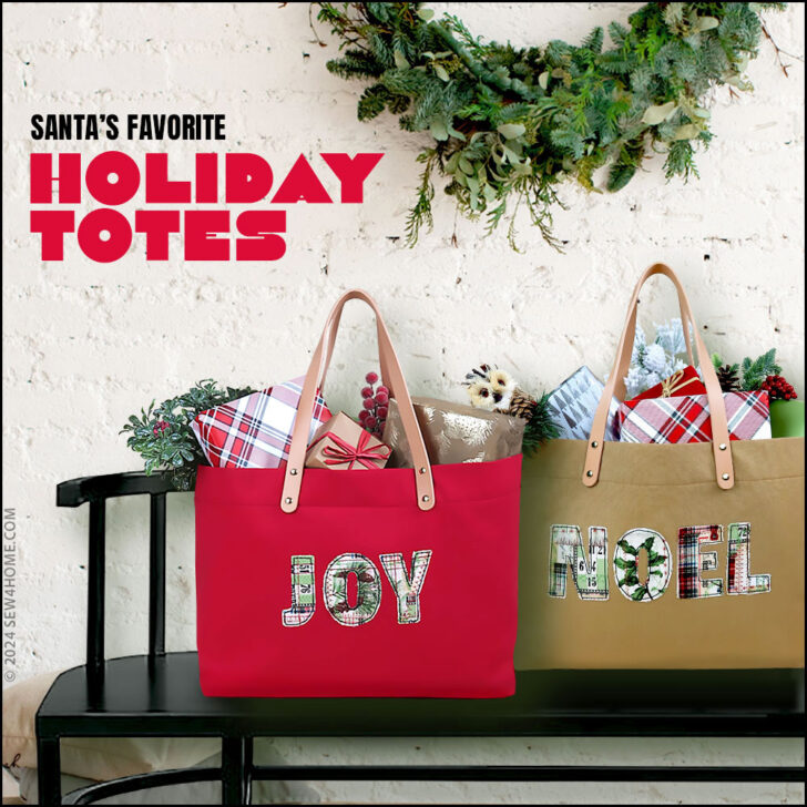 Our samples are made with a linen/cotton blend for the exterior and a quilting cotton for the lining in a homespun stripe that adds a fun pop of color on the inside. There’s just a single layer of fusible fleece to add a bit of structure. The finished totes are soft and flexible so they’re easy for Santa (and Santa’s helpers) to load up with lots of packages. And, they’re lightweight enough to hang — even if you don’t have a chimney.