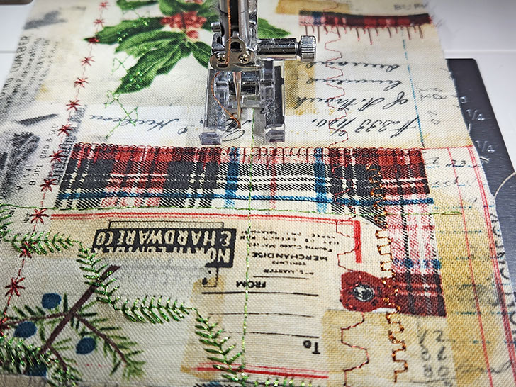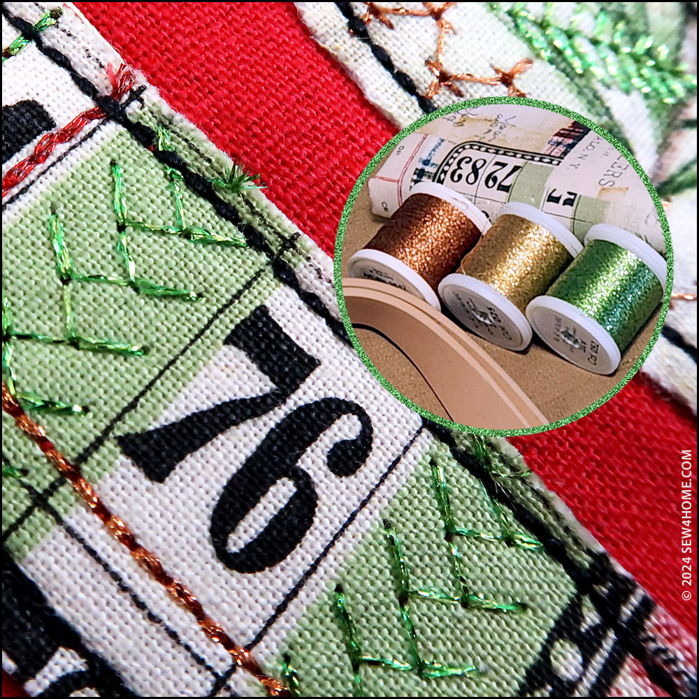 - With your appliqué fabric stabilized, you’re ready to add some random lines of decorative stitching in a variety of colors and stitch patterns. As mentioned above, we used metallic thread in holiday tones of gold, red, green, silver, and copper. The stitches we selected on our Janome Skyline S9 included: Heirloom #8, Quilting Stitches #18, #26, #27, and Long #14.