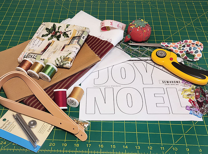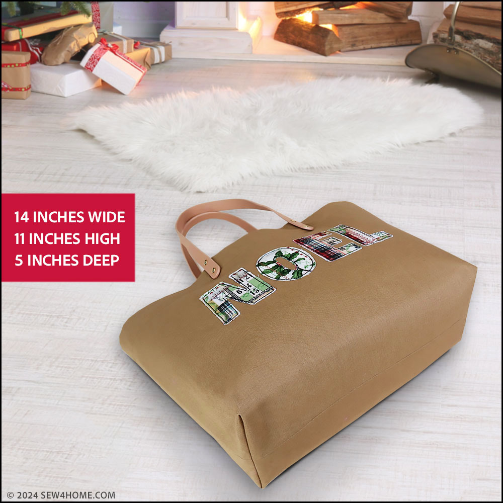 NOTE: You’ll want to practice, so you may want to purchase ⅓ or ½ yard of your festive fabric to insure you have plenty of motif area from which to choose. And when selecting your fabric, remember you want something with a variety of colors and patterns so there is something interesting within each of the appliqué letters. - ONE pair of leather or faux leather handles; we used a faux leather set, with its own gold tone rivets, measuring apx. 21” end-to-end, resulting in an 8” drop from the top of the curve to the top of the tote.