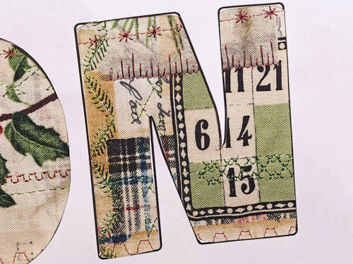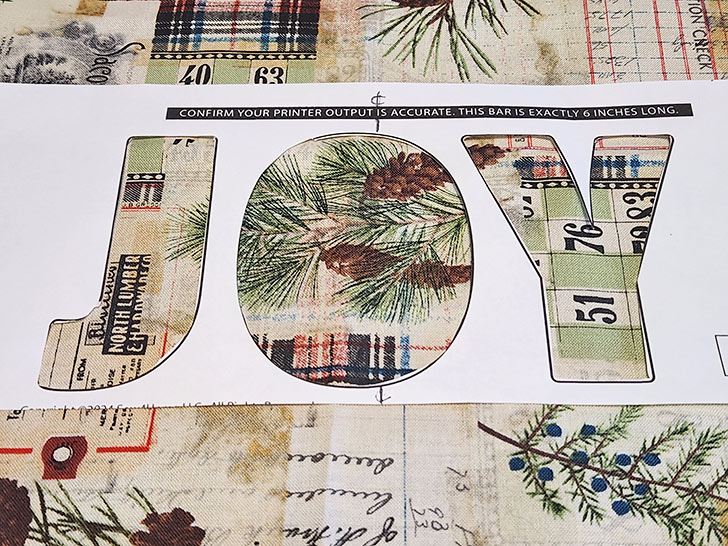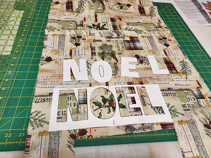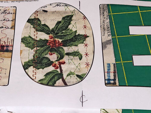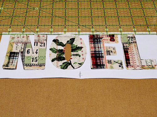 When choosing the fabric for your appliqué, look for a smaller motif with a variety of images and colors. We originally used Woodland Collage from the Holidays Past collection by Tim Holtz for FreeSpirit Fabrics. It checked all the boxes with lots of different areas to highlight in both light and dark tones. You can spot a classic red plaid, deep green holly, and pine tree sprigs peeking out within each of our JOY and NOEL appliqués.