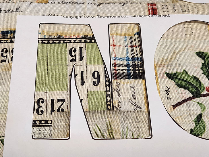 - Find the fabric you’re using for the appliqué letters. Using the window frame, move around the fabric to find the best area for each letter.