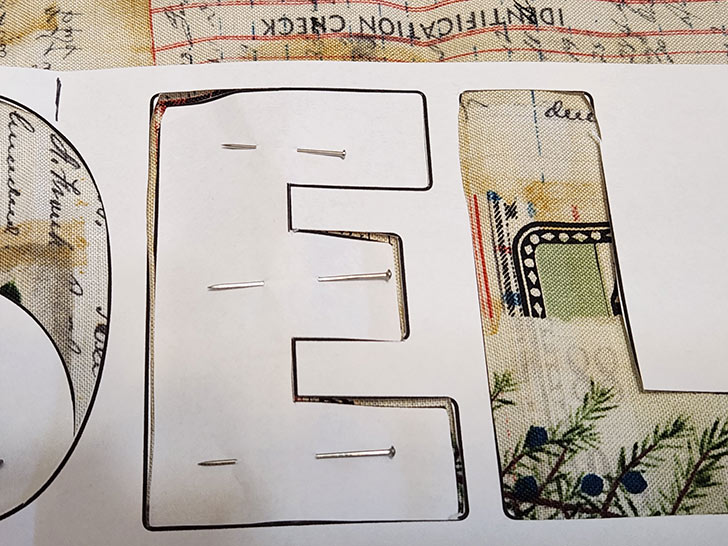 - Place each paper letter into place through the frame and pin the letter to the fabric.