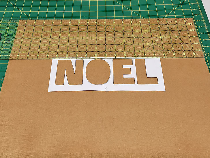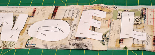 - Align the letters you’ve chosen on your cutting mat first. When you have them kerned to your liking, tape them in place on the mat. Bear in mind that the final width of your word/name should not be wider than about 9½” – 10” (the approximate width of our word NOEL) in order to center nicely on the font of the bag.
