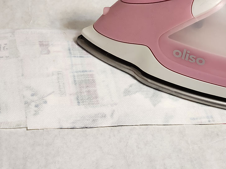 - Place a panel of fleece on the wrong side of each exterior panel, centering it side to side and with ½” of fabric showing beyond the fleece along the bottom and 2½” of fabric showing beyond the fleece along the top. Following manufacturer’s instructions, fuse in place.