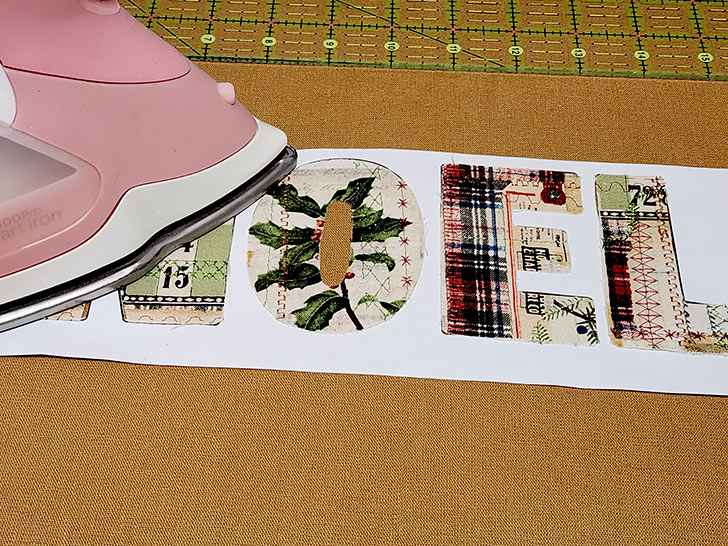 - With the letters lightly adhered, remove the frame, bring the panel to your ironing board, and press the letters firmly into place.