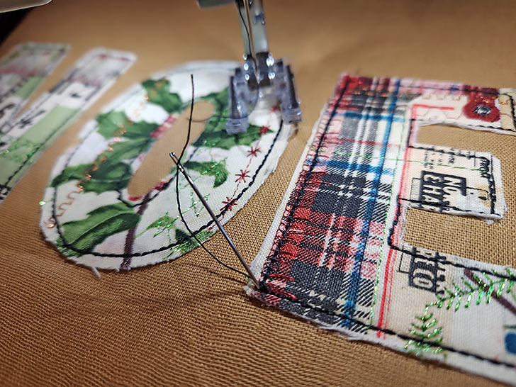 - Multiple colors of thread for the decorative stitching, we used an assortment of metallic thread in holiday tones (red, green, copper, silver, and gold) plus ONE dark color (we used solid black) for the final appliqué stitch that adheres each letter
