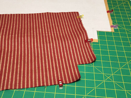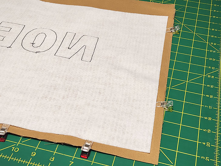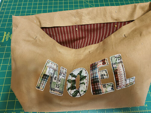 - Find the plain exterior back panel and place it right sides together with the appliquéd front panel. Pin or clip together along both sides and across the bottom.