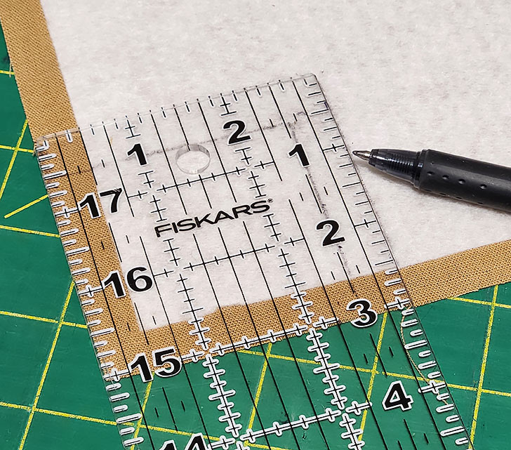 - Measure and mark squares of equal size at each corner. For this tote, we want a 5” finished corner, which means our squares are HALF that or 2½” x 2½”.
