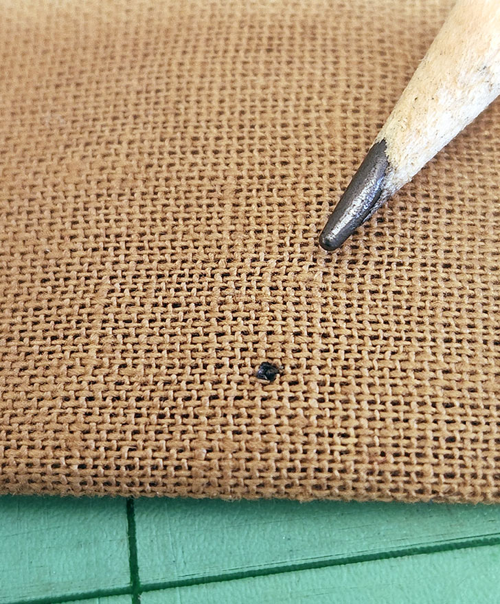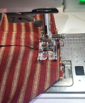 - Re-thread with the slightly contrasting all-purpose thread in the top and bobbin. On our samples, we used a slightly darker tan on the Leather linen and a slightly lighter red on the Crimson linen.
