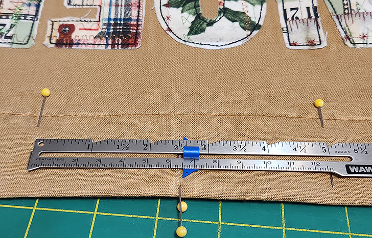 - Center the frame side to side so the top of the letters are 6” down from the top raw edge of the panel.