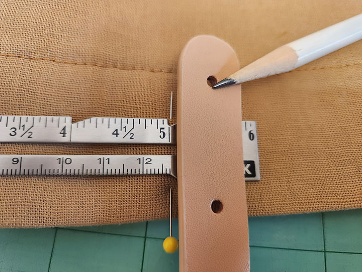 - Insert a marking pen through each hole to create each of the four rivet points. Repeat to mark for the back handle.