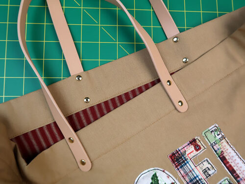 Purchased handles in faux leather are riveted in place. Of course, the type of handles is totally up to you. You could decide to go with shorter or longer handles, opt for bamboo or balsa, or even create your own corded handles using the exterior fabric.
