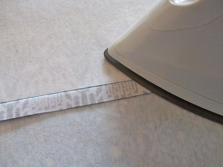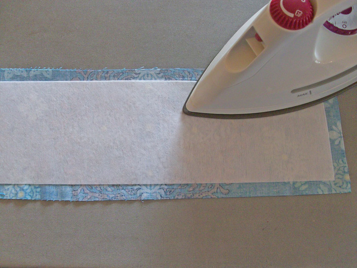- Following manufacturer’s instructions, fuse interfacing to the wrong side of each front fabric piece, centering the interfacing top to bottom and side to side so there is ½” of fabric showing beyond the interfacing on all sides.