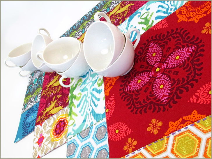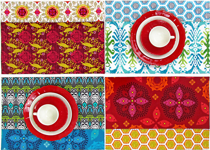 Not quite ready for such a big blast o’ color? Go neutral. Or, choose just three fabrics (two for all the fronts and one for all the backs) and make a completely matching set of two, four or more placemats.