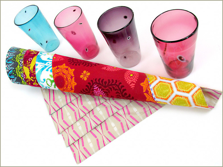 The serenity of a neutral palette is wonderfully cool and calming. But sometimes, you gotta shake things up with a burst… no, an explosion of color. This set of four mix-and-match placemats is designed to use up to nine different fabrics (eight for the two-part fronts and one for all the backs) in super bold colors and patterns. We chose riveting jewel tones, which are drop dead gorgeous, but this project is just begging for your own infusion of style. A hand running stitch in a thick floss across the bottom panels adds a subtle dash of handmade flair.