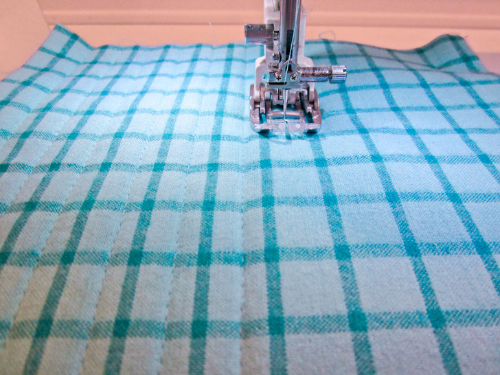 4. Straight-line quilt (sometimes called channel quilting) through all the layers of each quilt sandwich. We used the plaid lines of our selected fabric as the spacing guide for our channel quilting, running our quilting lines between the printed lines of the plaid. This gave us lines approximately ⅝” apart. You can do something similar with the motif on your chosen fabric, or you could use a quilting bar to set an even distance, or pre-draw lines to follow with an erasable fabric pen or pencil.