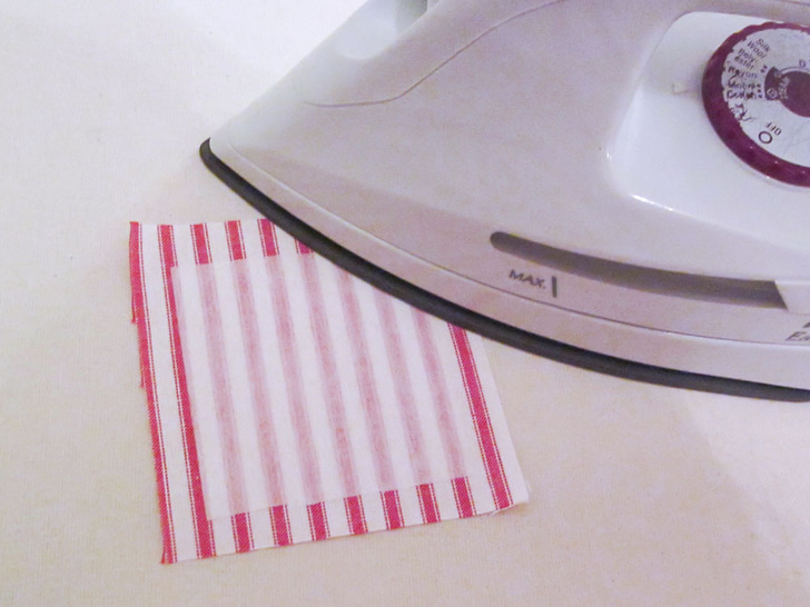 1. Find the 4″ x 4″ fabric squares and the 3″ x 3″ interfacing squares. Center an interfacing square on the wrong side of each fabric square.